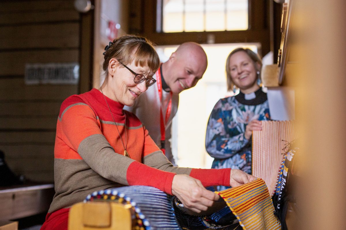 Korpilahden kirkon kellotapulissa on kudottu kesän aikana kangaspuilla. Eeva Nyberg (etualalla) ja Antti Koivisto sekä Miina Karasti ihastelevat värikkäitä istuma-alustoja, jotka tulevat lasten käyttöön kirkkosalissa.