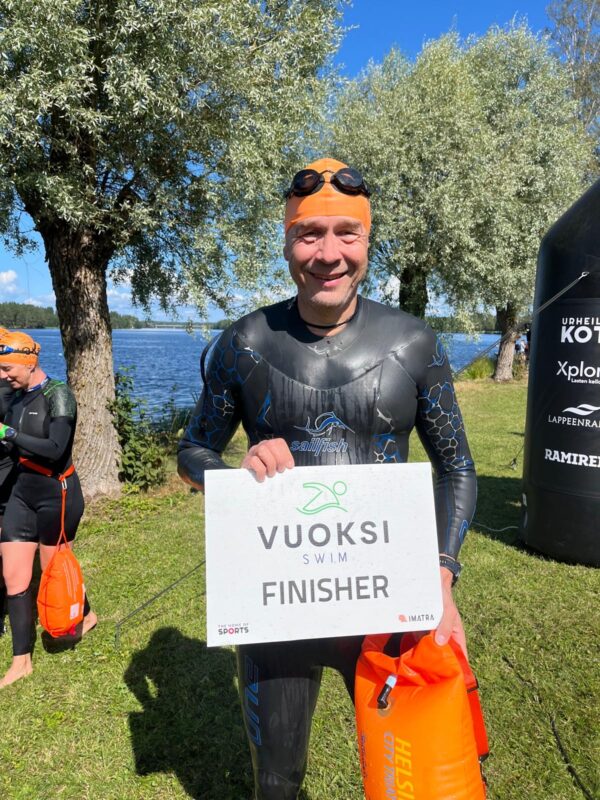 Lähetystyö ei ole pikamatka. Tässä Magnus Riska Imatralla Vuoksi Swim uintitapahtuman maalissa. Tapahtumassa uidaan kaikkiaan 10 kilometria, ensin Vuoksi-jokea pitkin ja sitten Saimaasssa.