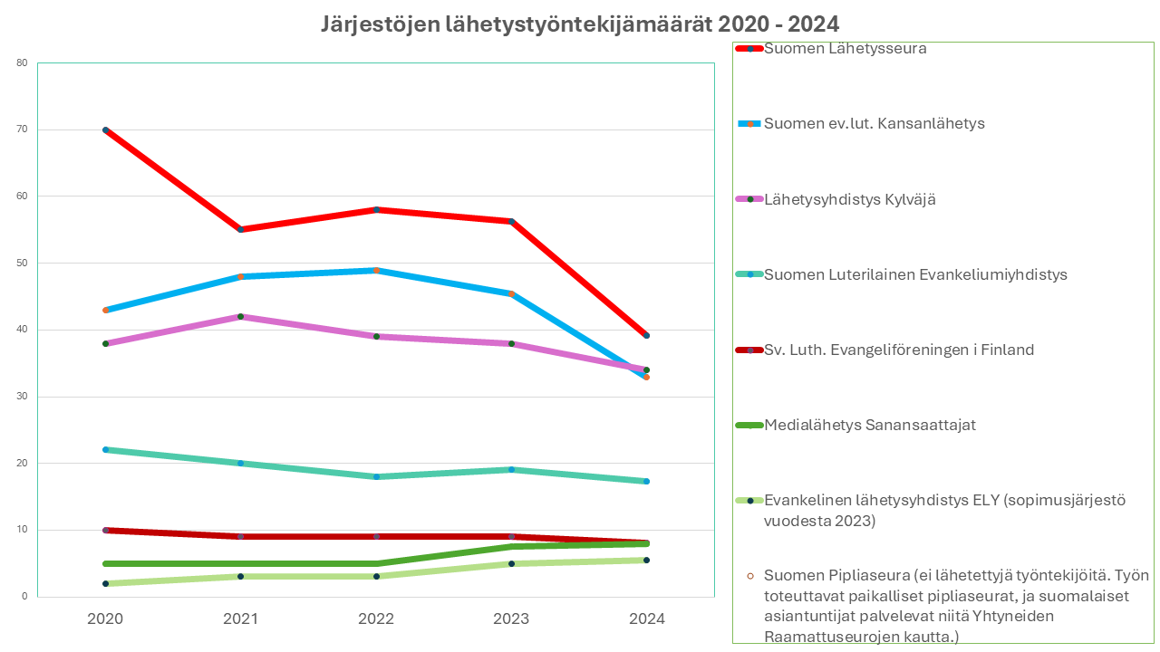 Kaaviokuva Suomen ev.lut. kirkon lähetystyöntekijöitten määrät 2020-2024