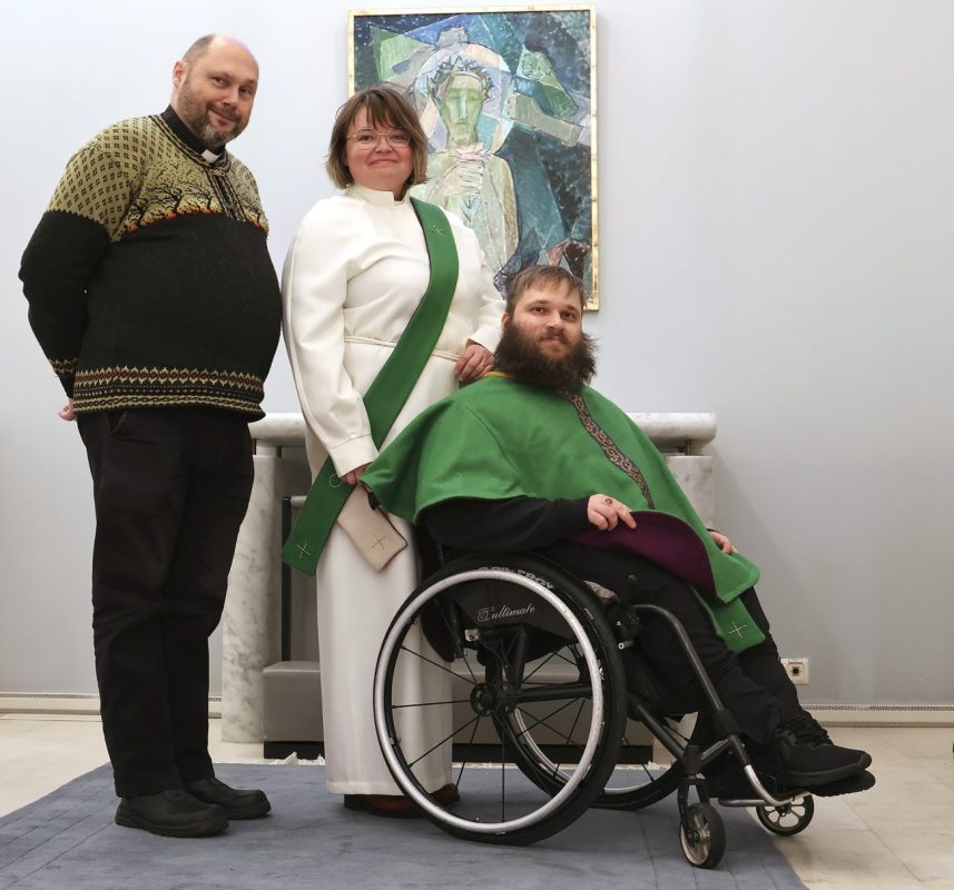 Seuraava kuva Kokkolan kirkon liturgiset vaatteet. Kokkolan suomalaisen seurakunnan kappalainen Petri Kasari (vas.), diakoniatyöntekijä Johanna Rönnkvist ja oppilaitospastori Antti Björklund Toimituskappelin alttarin edessä.